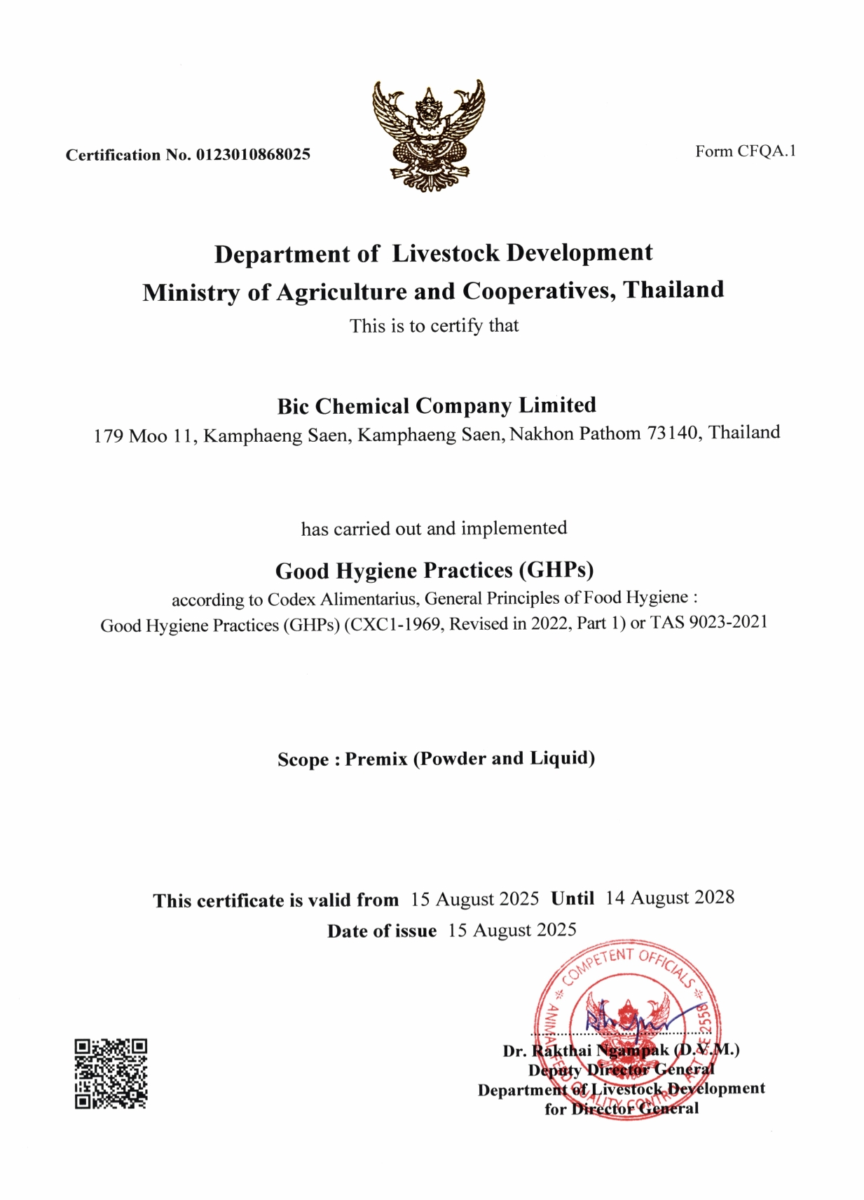 ระบบการผลิตและการจัดการสำหรับผลิตภัณฑ์กลุ่มพรีมิกซ์ สารผสมล่วงหน้าสำหรับสัตว์และสารเสริมสำหรับสัตว์ เป็นไปตามมาตรฐาน FAMI-QS GHPs HACCP มาตรฐานการจัดการ ISO9001 เป็นมิตรกับสิ่งแวดล้อมภายใต้นโยบายโรงงานสีเขียวและระบบมาตรฐาน ISO14001 มีการตรวจสอบคุณภาพของสินค้าด้วยเครื่องมือวิเคราะห์ที่มีความแม่นยำสูง ครอบคลุมทุกกลุ่มผลิตภัณฑ์ทั้ง ชนิดผงผสมอาหาร ชนิดผงผสมน้ำ ชนิดน้ำ และชนิดเม็ด